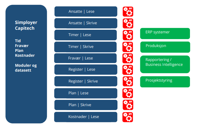 Det er egne API pakker for forskjellige moduler som timer, fravær, plan, register (ansatte, avdelinger, prosjekt mv). Om en kun skal hente data fra Capitech trenger en API pakke for å lese data, om en skal skrive data inn til Capitech trenger en naturligvis API pakke for å skrive data.