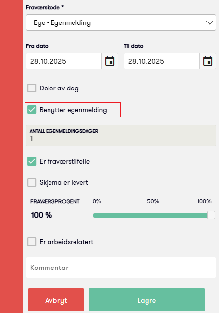 Det er også mulig å bruke andre fraværskoder, for eksempel permisjon med eller uten lønn, avhengig av virksomhetens retningslinjer.