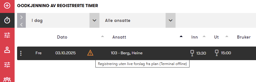 Hvis terminalen ikke har nettforbindelse, kan den ansatte fortsatt registrere seg inn ved hjelp av terminalens reserveløsning. I Flow Timer får leder nå varsel om slike registreringer, slik at de enkelt kan kontrolleres og eventuelt korrigeres. Disse vises også ved filtrering på registreringer med advarsel.