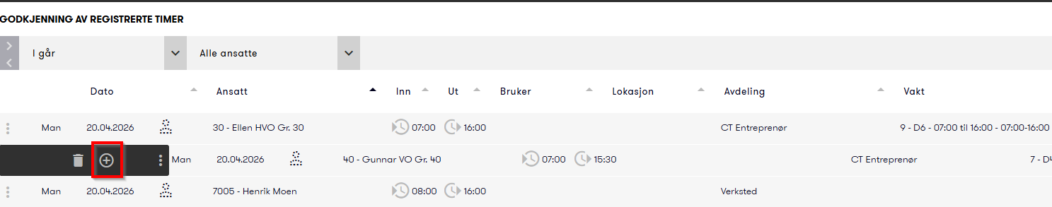 Trykk på de tre prikkene til venstre for en registrering, og deretter plusstegnet for å legge til timer på den ansatte.