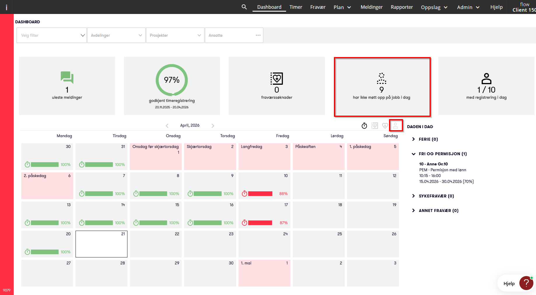 For å finne ansatte med manglende oppmøte, gå enten via snarveiene på Dashbord, eller åpne Timer og filtrer her på manglende oppmøte.