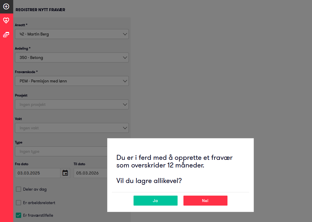 Når du registrerer et fravær som varer mer enn ett år, får du nå et kontrollspørsmål før lagring.