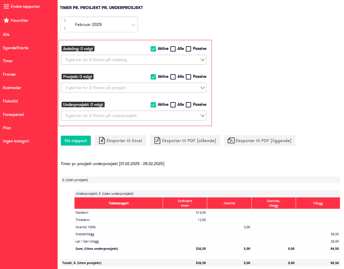 Det betyr at dersom du for eksempel vil hente ut rapporten Timer per prosjekt per underprosjekt for alt du har tilgang til, holder det nå med ett klikk på Vis rapport.