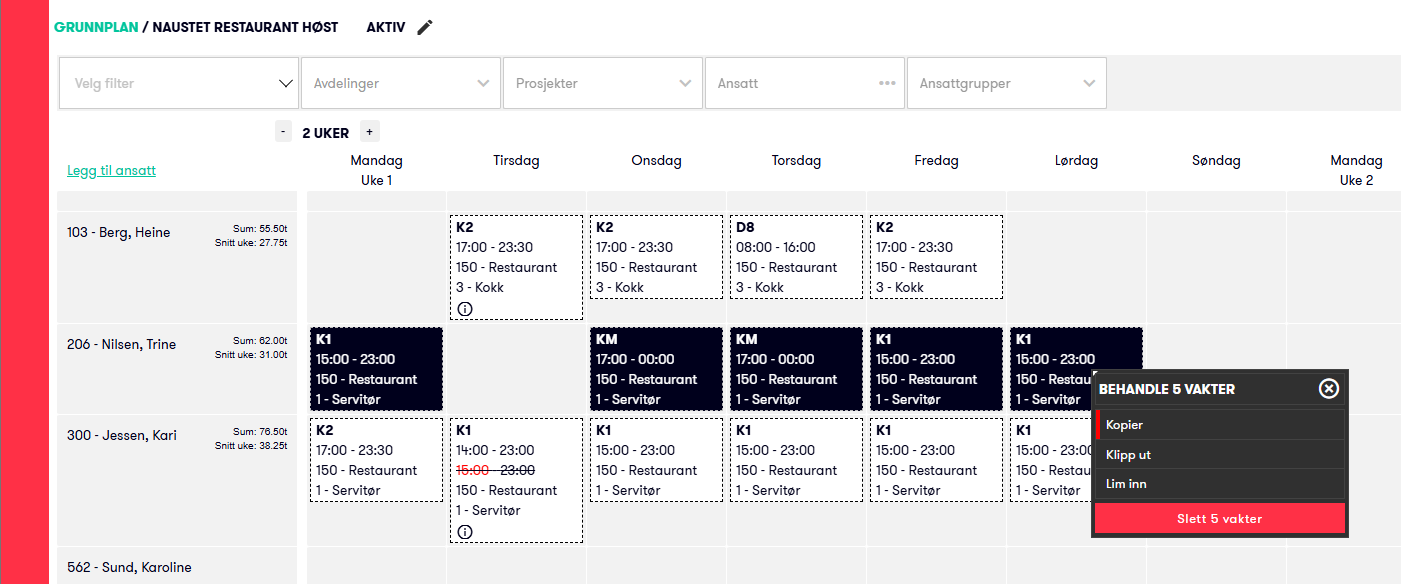 Tips: Hvis du kopierer for eksempel to uker med vakter og limer dem inn på siste uke i grunnplanen til en annen ansatt, vil vaktene for siste uke automatisk bli kopiert inn på uke 1. Dette gjør det enkelt å bygge opp turnuser som går over flere uker.