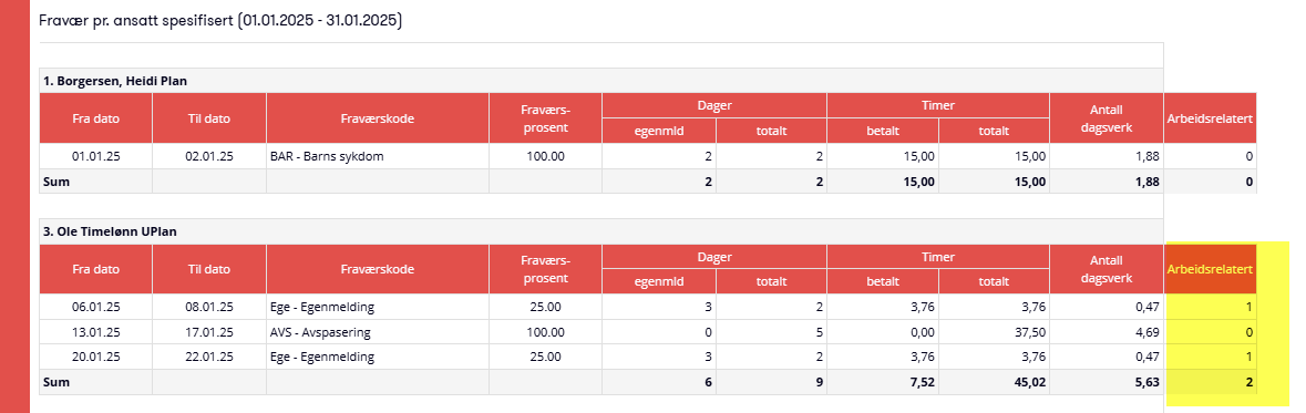 Rapporten er utvidet med en egen kolonne for Arbeidsrelatert, slik at det blir enklere å se hvilke fravær som er registrert som arbeidsrelaterte.