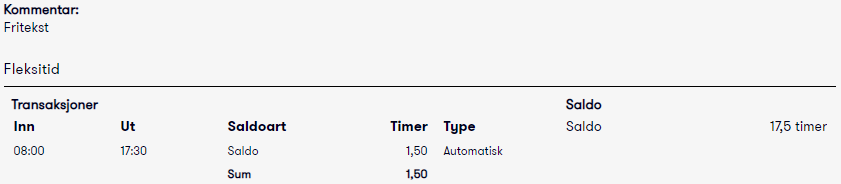 Hvis den ansatte har flekstidsberegning, vises også informasjon om bevegelser i flekstid/timebank knyttet til registreringen. Her vises også samlet fleksitidssaldo per i dag.