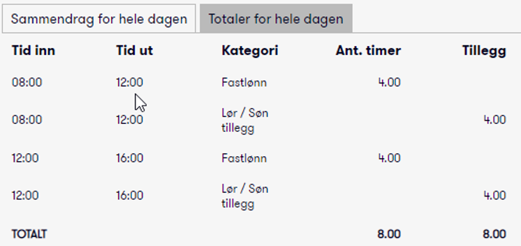 Du kan også se oppsummeringer for den ansatte per dag.