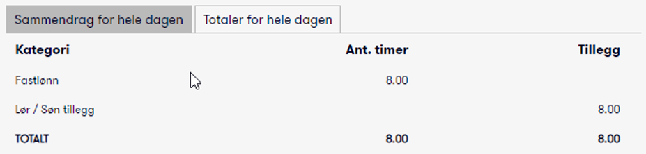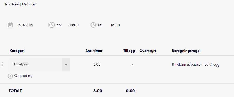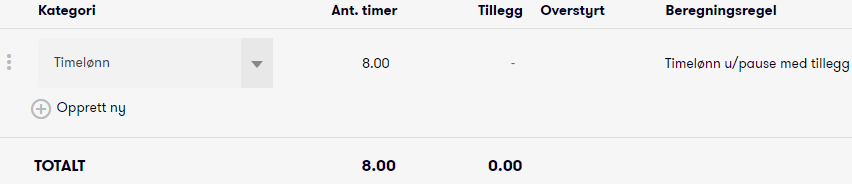 Viser hvor mange timer som er registrert eller beregnet for registreringen. I eksempelet er timene beregnet ut fra klokkeslettene 08:00 - 16:00, som gir en sum på 8.00 timer.
