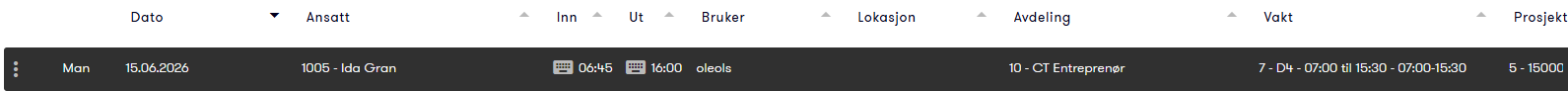 I Timer får du en oversikt over de ansattes registreringer. Hver registrering viser et sammendrag av informasjonen, og du kan se flere detaljer ved å trykke på selve registreringen.