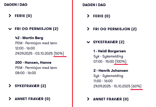 Sykemeldinger vises alltid med fraværsprosent, siden graderte fravær er vanlig. For andre typer fravær vises fraværsprosent bare når den ikke er 100 %.