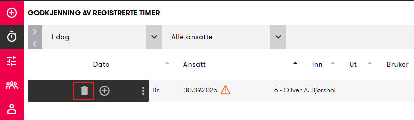 Det er nå mulig å slette en ubehandlet utregistrering direkte i Timer. Dette er nyttig for eksempel dersom en ansatt har registrert seg ut to ganger.