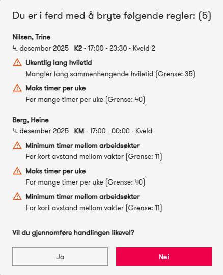 Hvis et vaktbytte utløser advarsler, får leder disse samlet ved godkjenning. Lederen kan da velge å avslå eller godkjenne likevel.