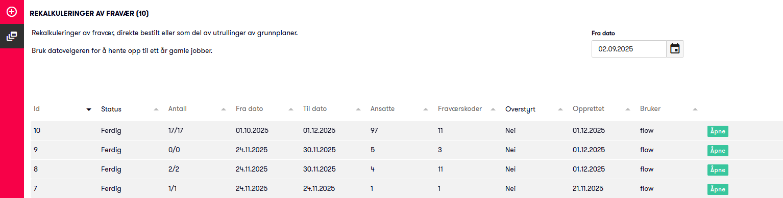 - listevisning over alle rekalkuleringsjobber