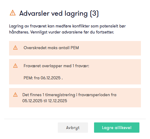 Dersom lagring av fravær utløser flere advarsler, vises disse nå samlet i ett skjermbilde.