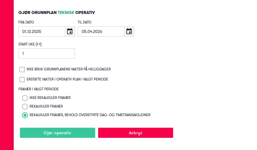 Når en grunnplan gjøres operativ, kan det automatisk opprettes og kjøres rekalkulering av fravær. Som standard foreslås det å rekalkulere fravær og beholde eventuelt overstyrte fraværstransaksjoner.