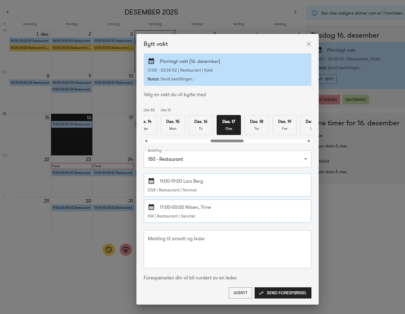 Når vaktbytte er aktivert, kan ansatte bruke Bytt-knappen på en vakt for å se hvilke vakter og ansatte det er mulig å bytte med. Det kan filtreres på dato og avdeling.