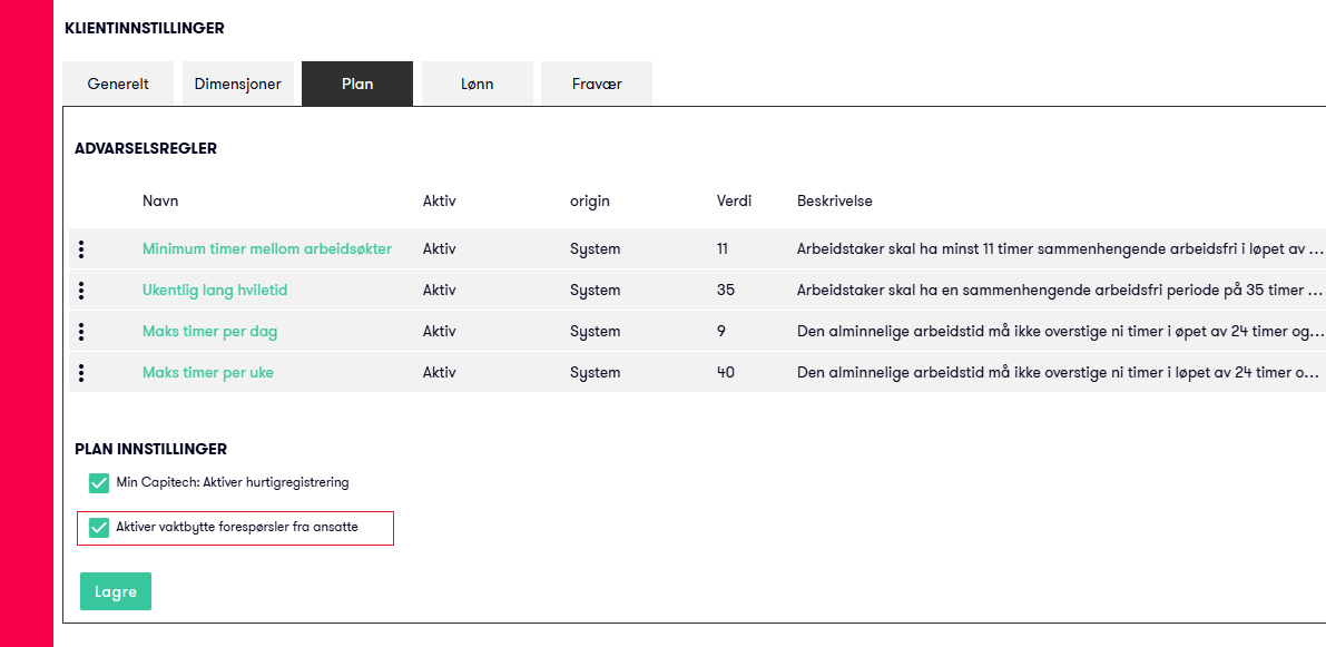 Admin → Klientinnstillinger → Plan